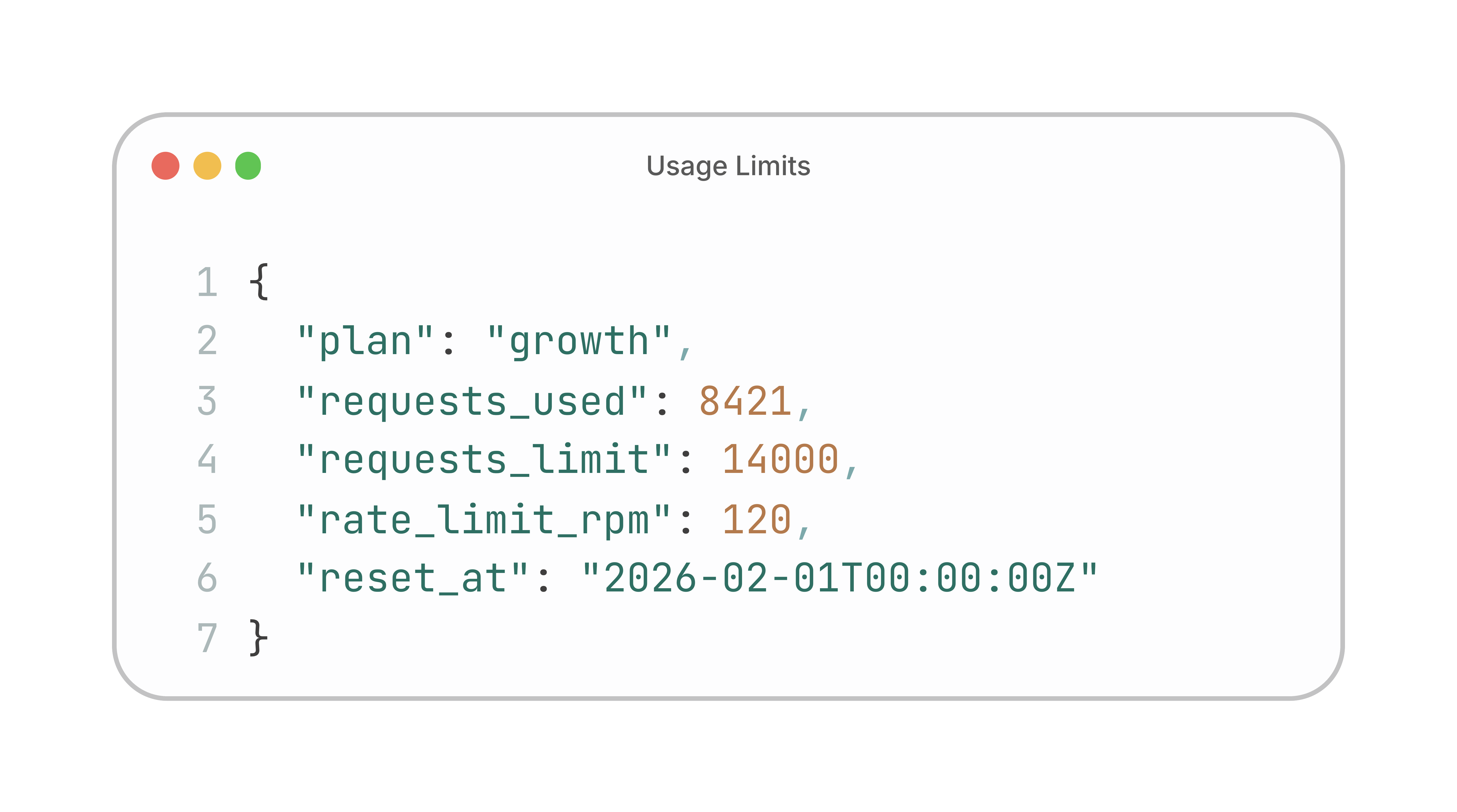 Clean schemas, predictable responses, and transparent limits—so you can ship with confidence.